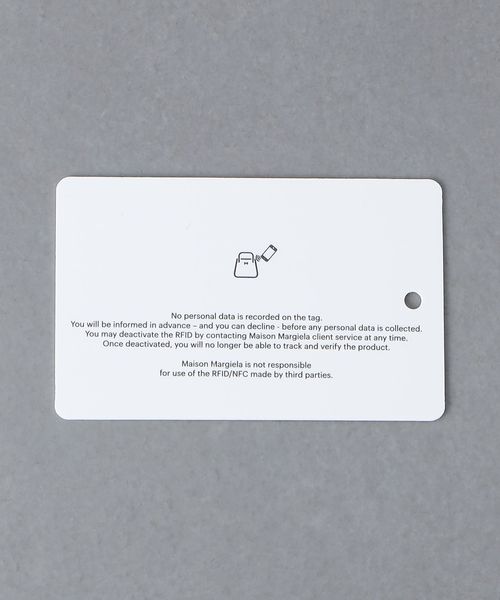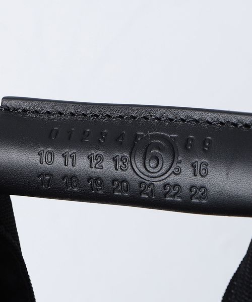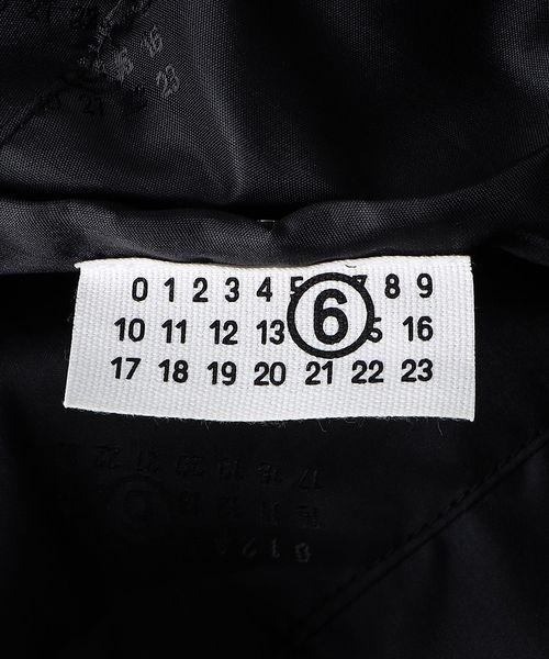 ガーメントやアクセサリーの背面には、白いシングルステッチでエムエム6のラベルが縫い付けられています。
