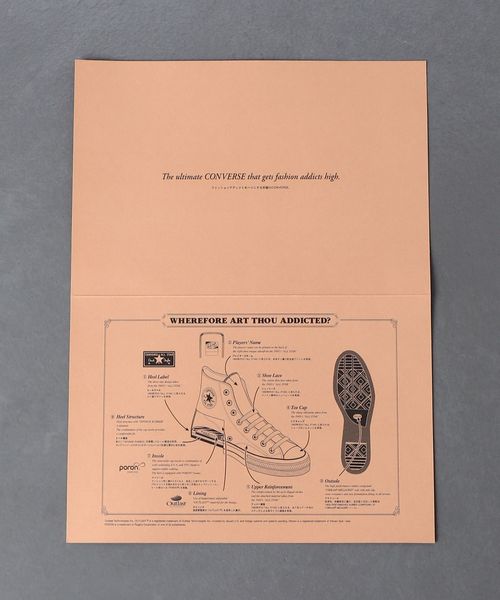 ADDICT(=依存する、中毒)が意味するとおり、ファッションコンシャスな人たちを魅了するCONVERSEの究極のシューズラインです。これまでのモデル同様に、三ツ星ヒールパッチ、シャープなキャップトゥなど、1960年代のチャックテイラーに見られるディティールは踏襲し、クッション性/軽量性/フィット性に優れたE.V.A.製のカップインソールや、防滑性や耐摩耗性に優れたVivram Megagrip のアウトソールを採用するなど更なるスペックアップで美しく機能的に昇華させています。
