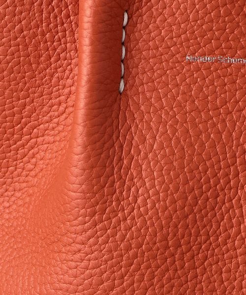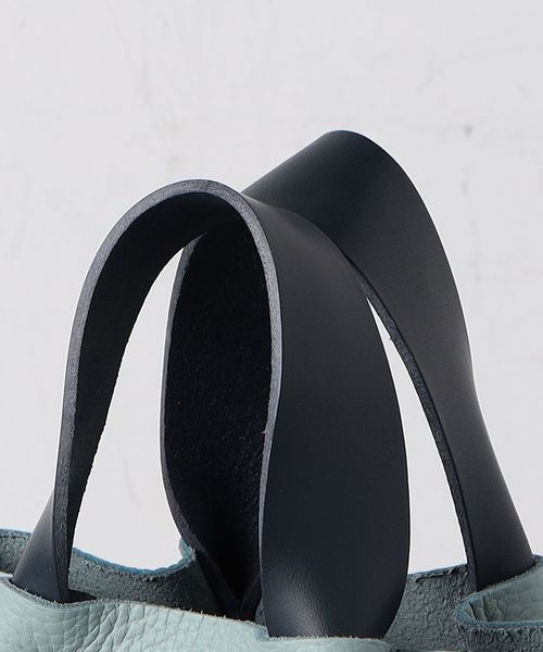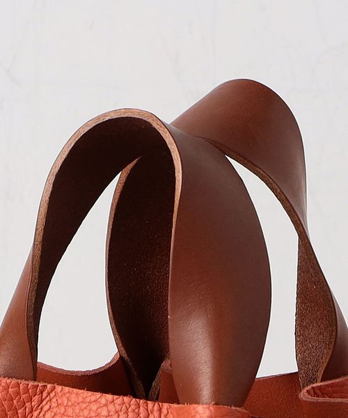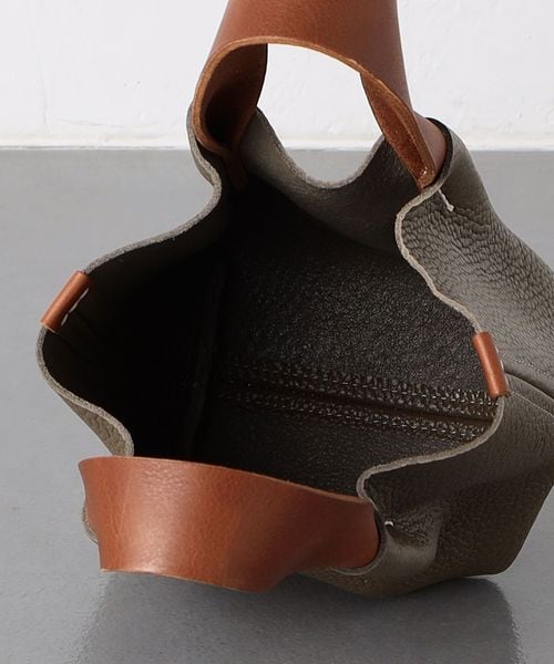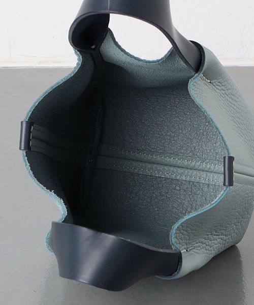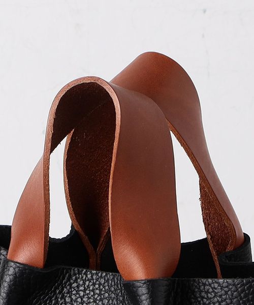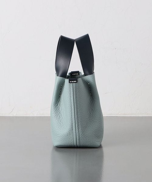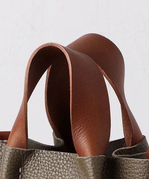 ハンドルの取り付けを摘まむように縫い付け、デザイン性にアクセントを加えたトートバッグ。