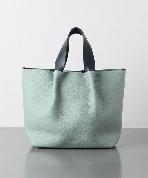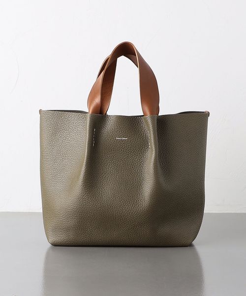 ハンドルの取り付けを摘まむように縫い付け、デザイン性にアクセントを加えたトートバッグ。