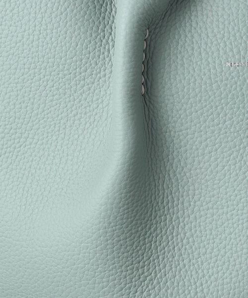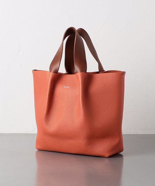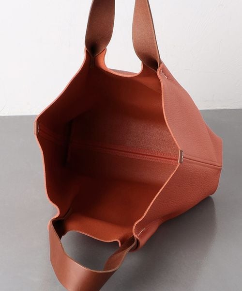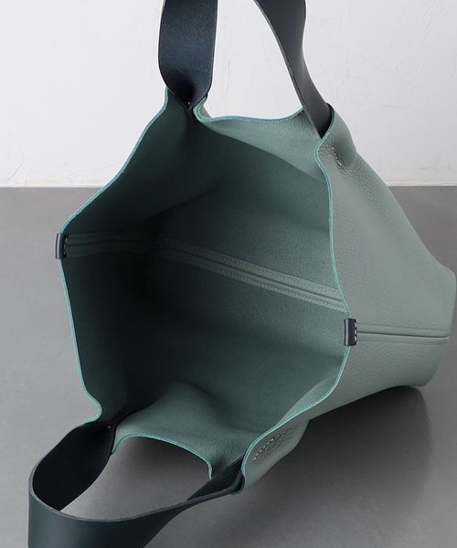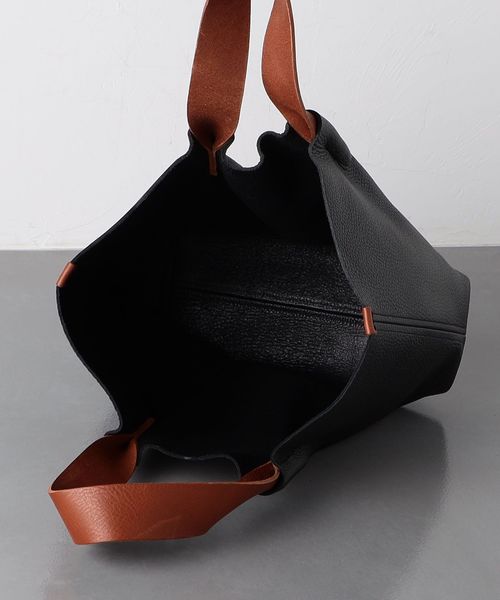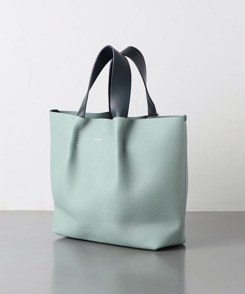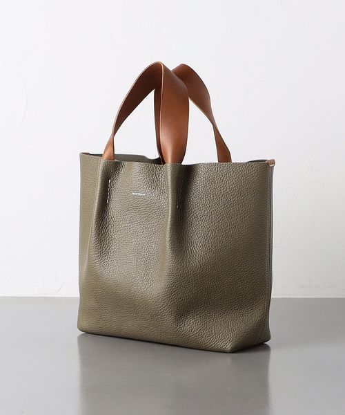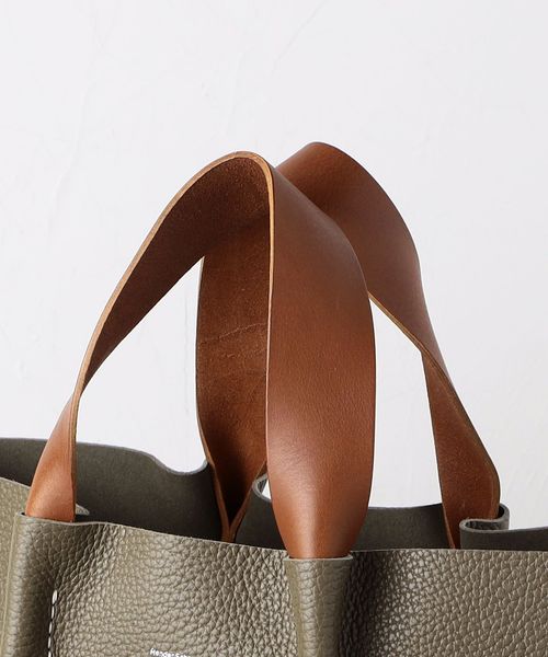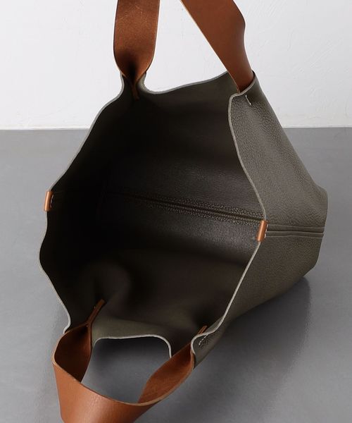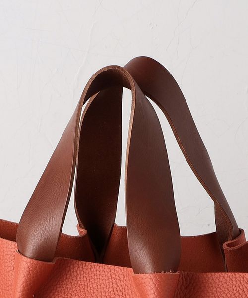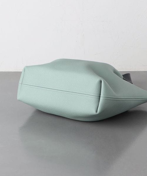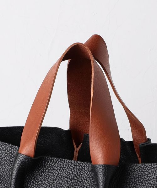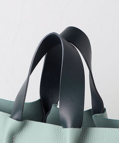 ハンドルの取り付けを摘まむように縫い付け、デザイン性にアクセントを加えたトートバッグ。