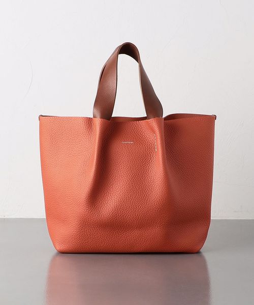 ハンドルの取り付けを摘まむように縫い付け、デザイン性にアクセントを加えたトートバッグ。