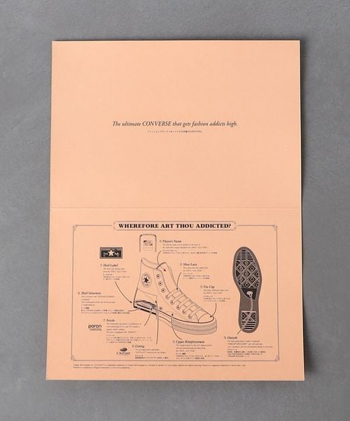 ADDICT(=依存する、中毒)が意味するとおり、ファッションコンシャスな人たちを魅了するCONVERSEの究極のシューズラインです。これまでのモデル同様に、三ツ星ヒールパッチ、シャープなキャップトゥなど、1960年代のチャックテイラーに見られるディティールは踏襲し、クッション性/軽量性/フィット性に優れたE.V.A.製のカップインソールや、防滑性や耐摩耗性に優れたVivram Megagrip のアウトソールを採用するなど更なるスペックアップで美しく機能的に昇華させています。