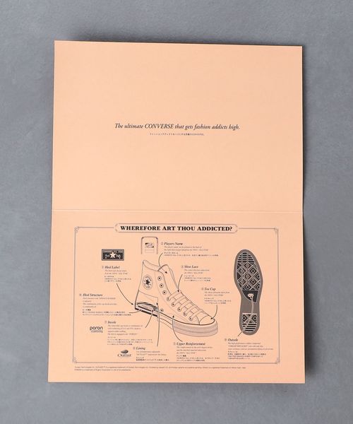 ADDICT(=依存する、中毒)が意味するとおり、ファッションコンシャスな人たちを魅了するCONVERSEの究極のシューズラインです。これまでのモデル同様に、三ツ星ヒールパッチ、シャープなキャップトゥなど、1960年代のチャックテイラーに見られるディティールは踏襲し、クッション性/軽量性/フィット性に優れたE.V.A.製のカップインソールや、防滑性や耐摩耗性に優れたVivram Megagrip のアウトソールを採用するなど更なるスペックアップで美しく機能的に昇華させています。