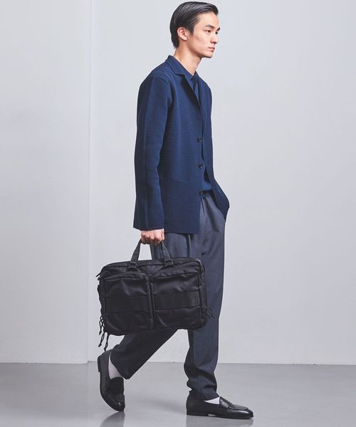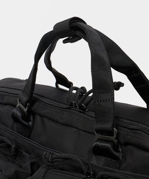 スーツやジャケットスタイルにもコーディネートしやすい「オールブラック」と「ブラック/ネイビー」の落ち着いたカラーリングや、主張しすぎないブラックxグレーのダブルネームタグがポイントの別注ブリーフバッグです。