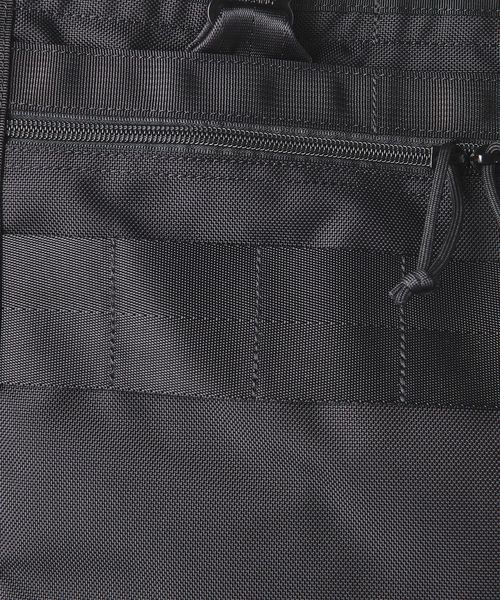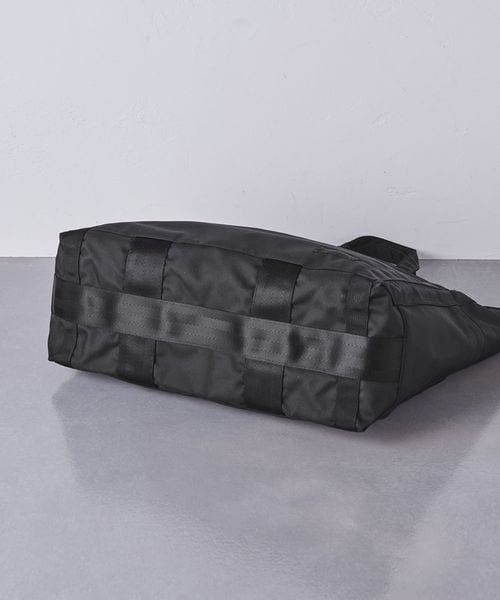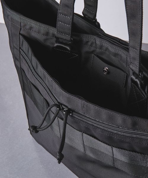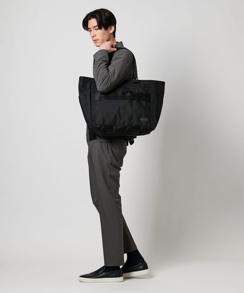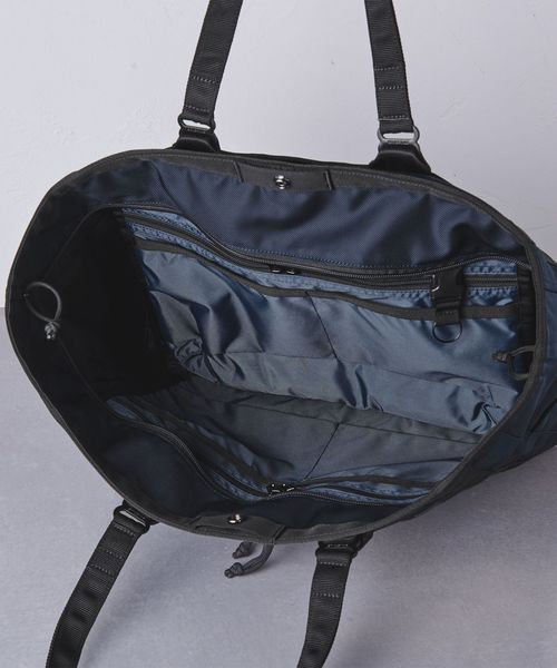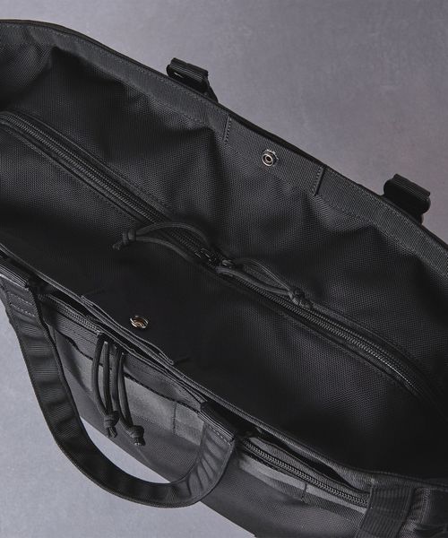 スーツやジャケットスタイルにもコーディネートしやすい「オールブラック」と「ブラック/ネイビー」の落ち着いたカラーリングや、主張しすぎないブラックxグレーのダブルネームタグがポイントの別注トートバッグ。