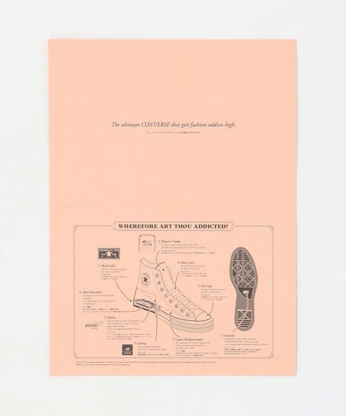 ADDICT(=依存する、中毒)が意味するとおり、ファッションコンシャスな人たちを魅了するCONVERSEの究極のシューズラインです。これまでのモデル同様に、三ツ星ヒールパッチ、シャープなキャップトゥなど、1960年代のチャックテイラーに見られるディティールは踏襲し、E.V.A.製のカップインソールや、Vivram Megagrip のアウトソールを採用するなど更なるスペックアップで美しく機能的に昇華させています。