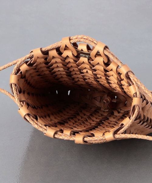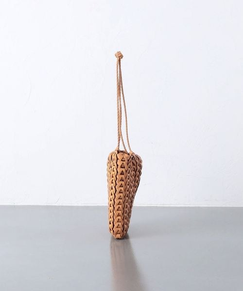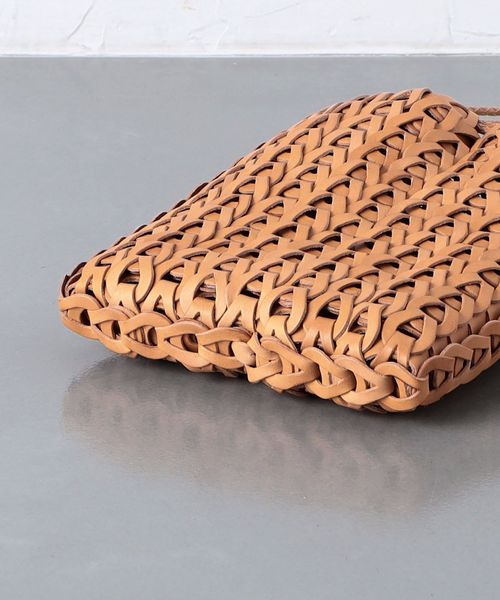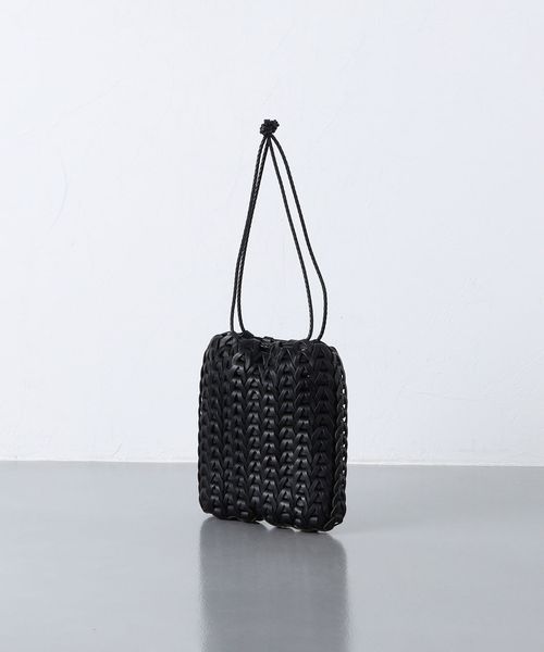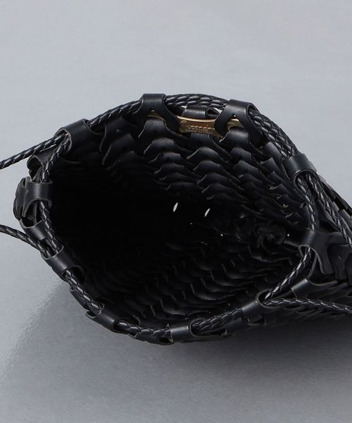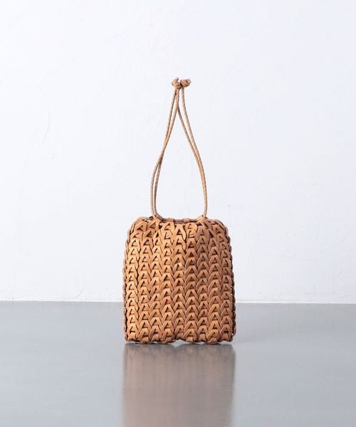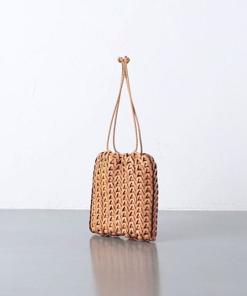 接着や縫製は用いず、革パーツを一枚一枚丁寧に編み込んで作られたハンドメイドの巾着です。