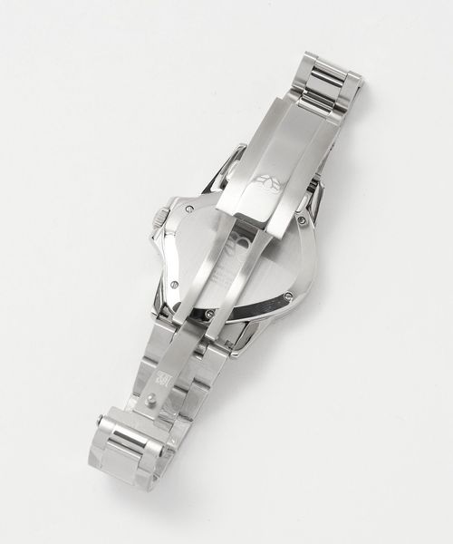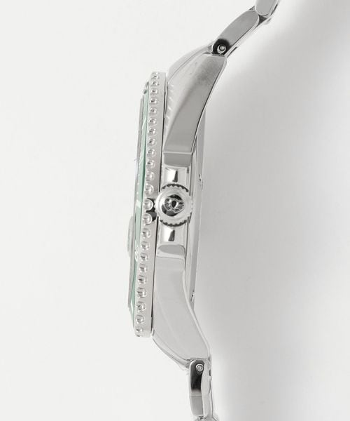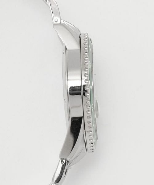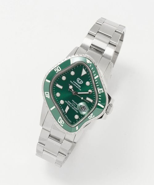 ステンレスのシルバーカラーベルトにグリーンのベゼル・文字盤が特徴です。
