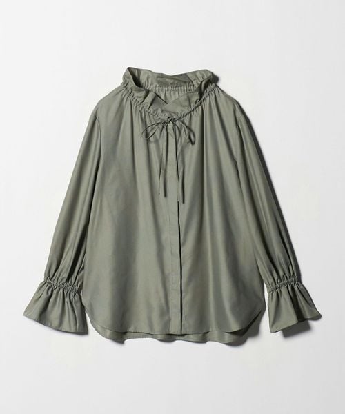 フリル×ドローストリングの襟元やベルスリーブの袖口がフェミニンなブラウス。