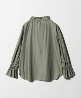 フリル×ドローストリングの襟元やベルスリーブの袖口がフェミニンなブラウス。
