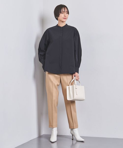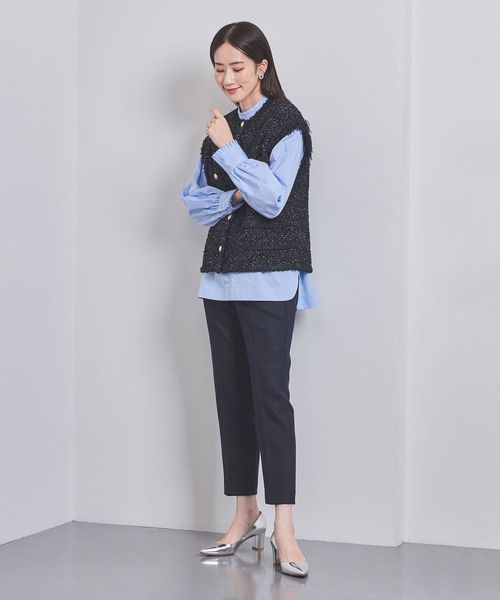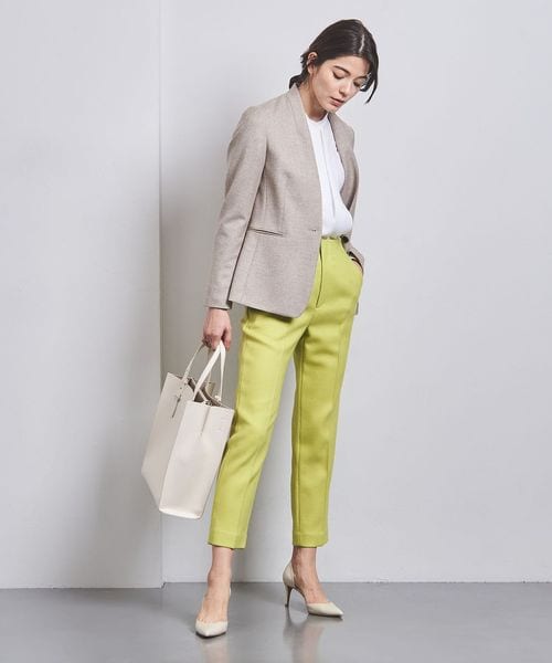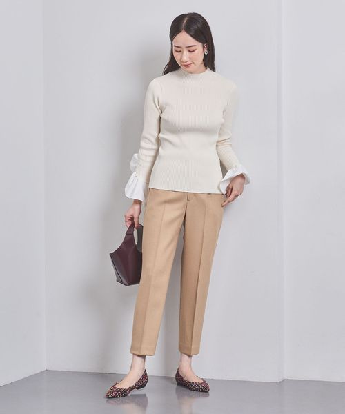 トップスにはデザインブラウスを合わせたり、リバー素材の上品なコートやベストとのスタイリングがおすすめです。