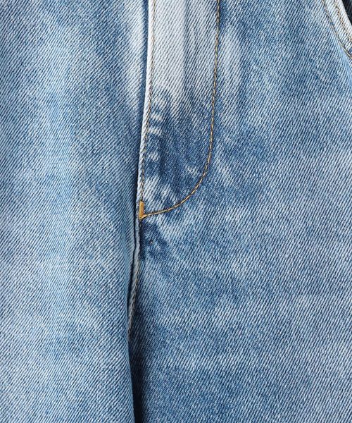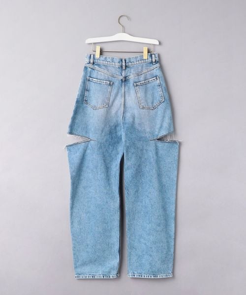 太もも部分の大胆なカッティングが目を引くデニムパンツ