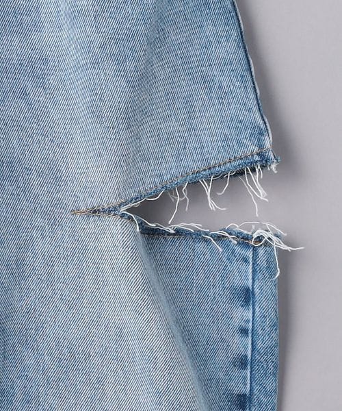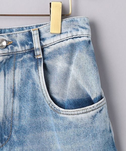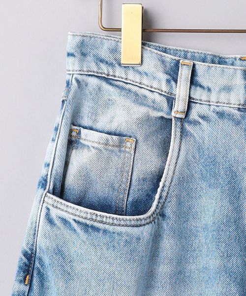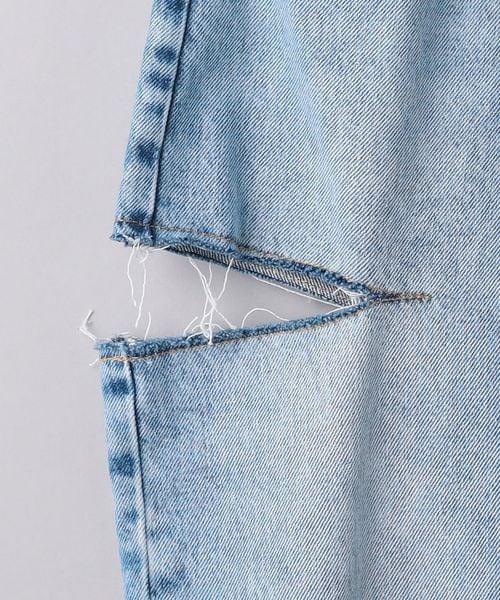 ラフなカットで、太もものスラッシュ部分からほつれた布が見えるデザイン。