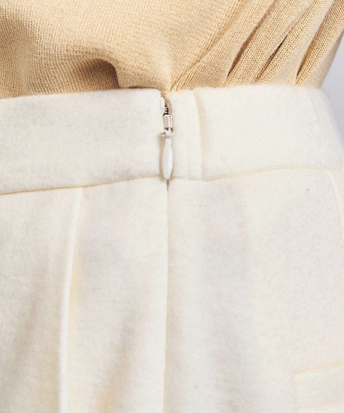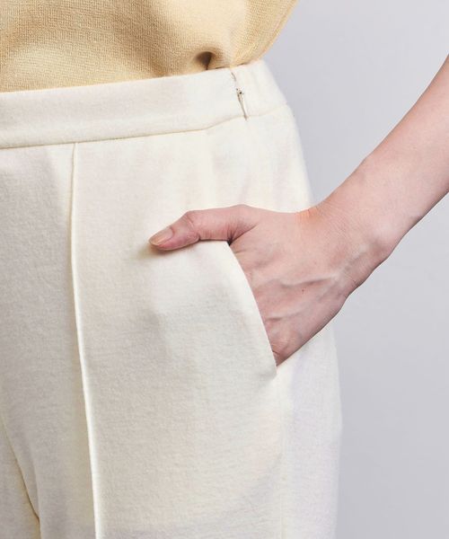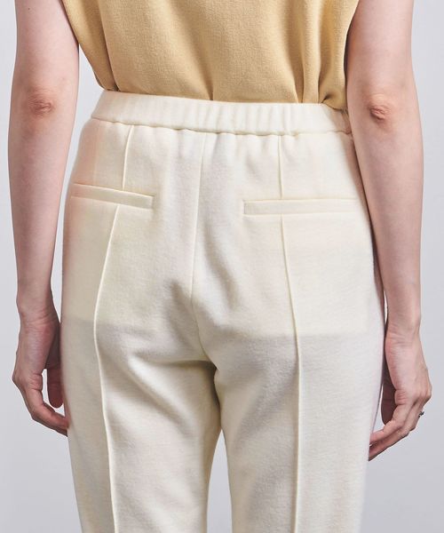 後ろウエストに平ゴムを入れ、センターフロントとセンターバックにピンタックをとり、ジャージー素材でもきちんと感を感じるデザインに仕上げました。