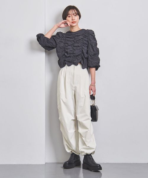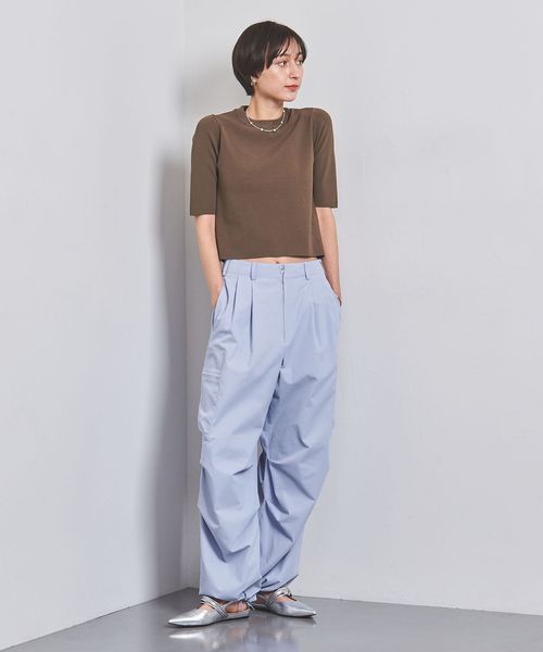 パンツのシルエットと対照的なコンパクトなトップスを合わせると、スタイルアップして見えます。