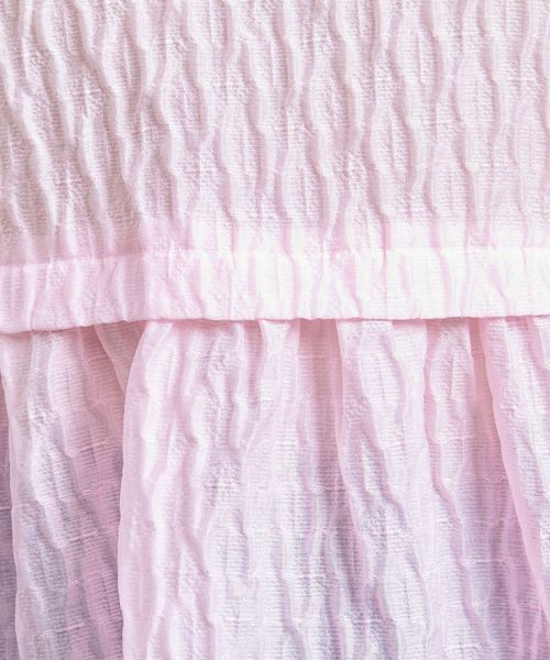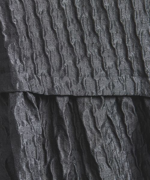 タテ糸にポリエステルの極細分繊糸を使用して、オーガンジーのようなハリや透け、光沢感を持たせ、ヨコ糸に2種類のポリエステルを使用しぷっくりとした膨れ感を表現。