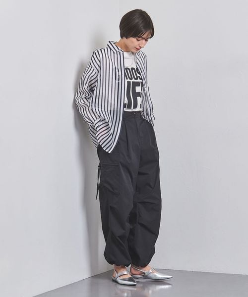 ボリュームボトムスには、フロントボタンを留めてタックインにした着こなしがおすすめ。