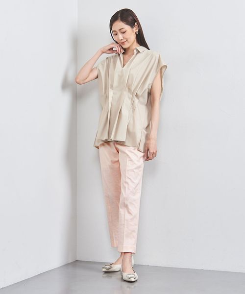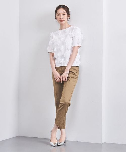 ベルトレスのややハイウエスト設定で、すっきりとしたウエスト周りが特徴のひとつ。