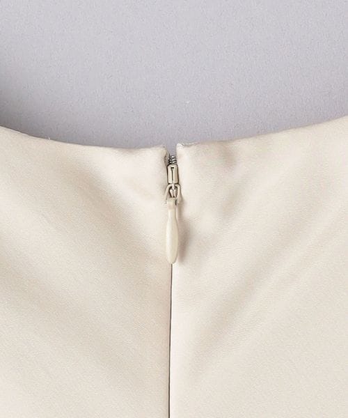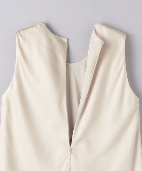 ラウンドネックから覗くデコルテとサテンの光沢が女性らしさを際立たせます。