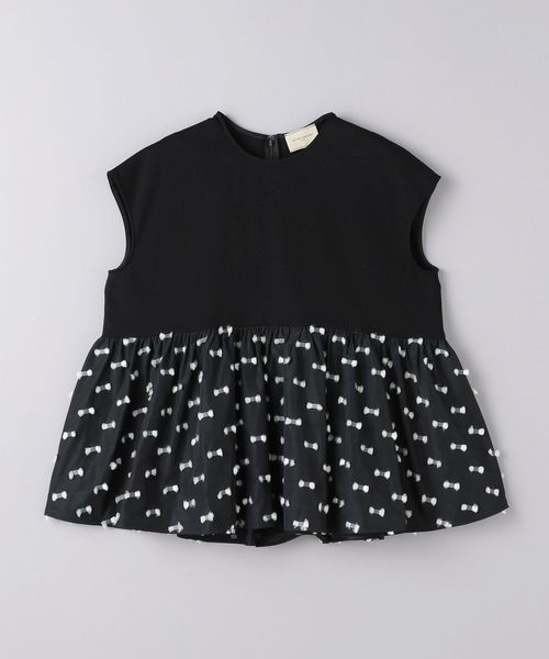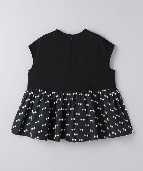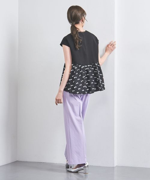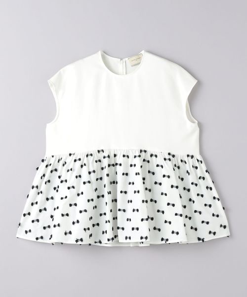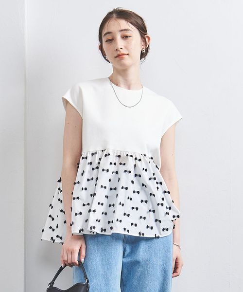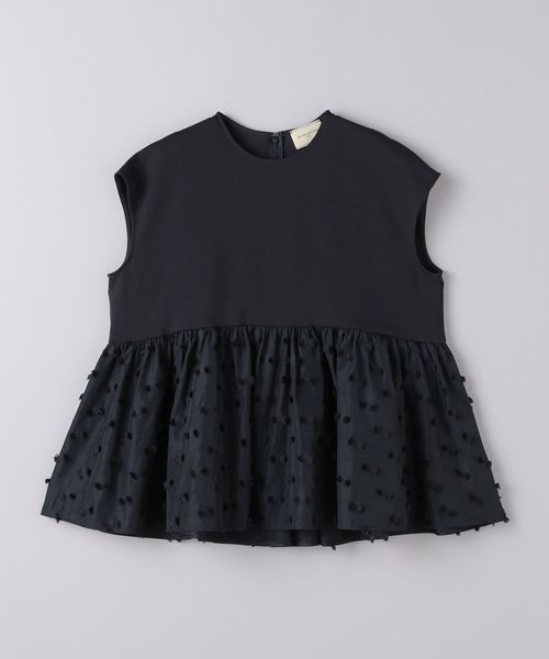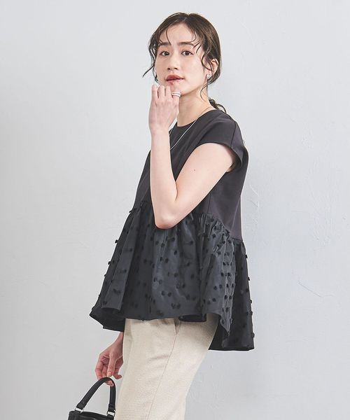 肩先がやや隠れるフレンチスリーブとラウンドした切替ラインのペプラムシルエットが女性らしいトップス。