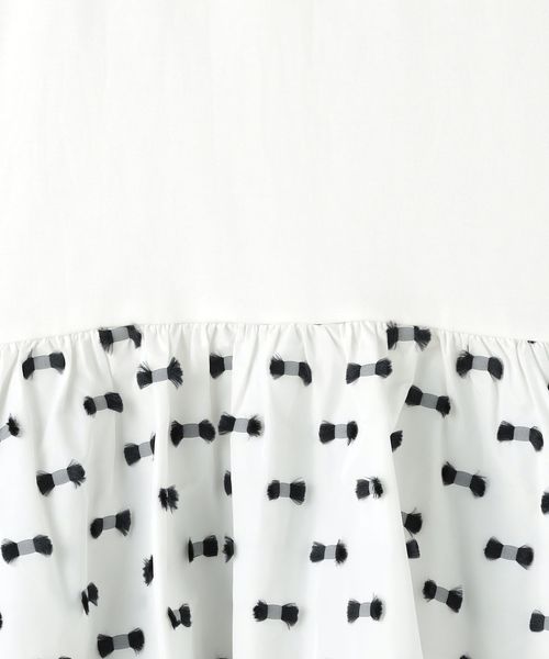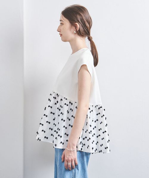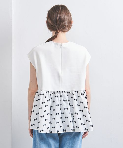 小さなリボンのようなカットジャカードの異素材ブラウス