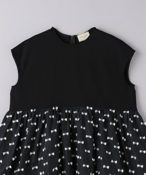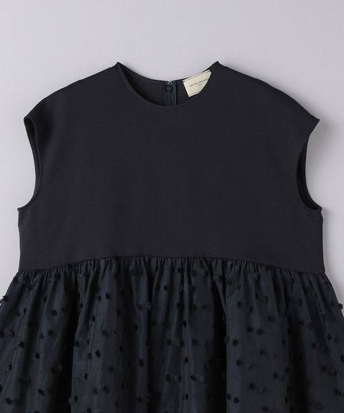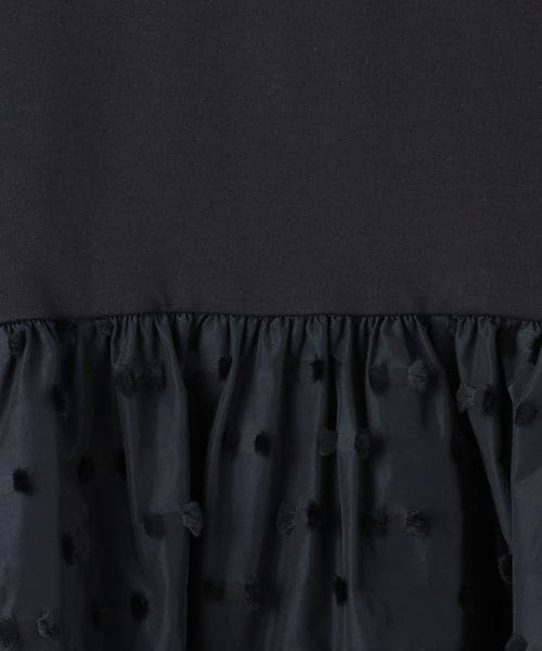 ジャージー素材の上部とフレアシルエットを作る布帛とのコンビネーションで、着心地の良さと華やかさを兼ね備えた一枚です。