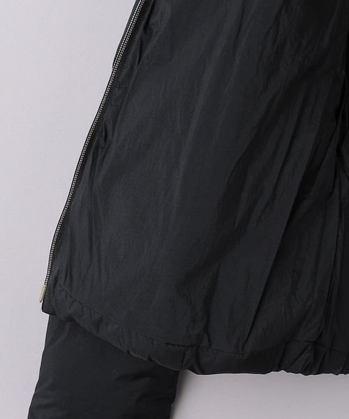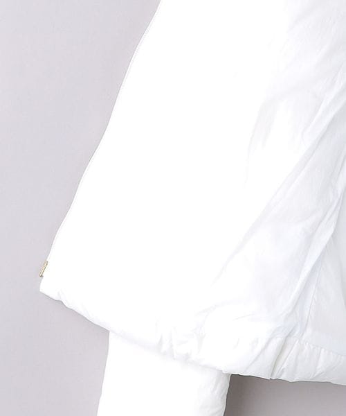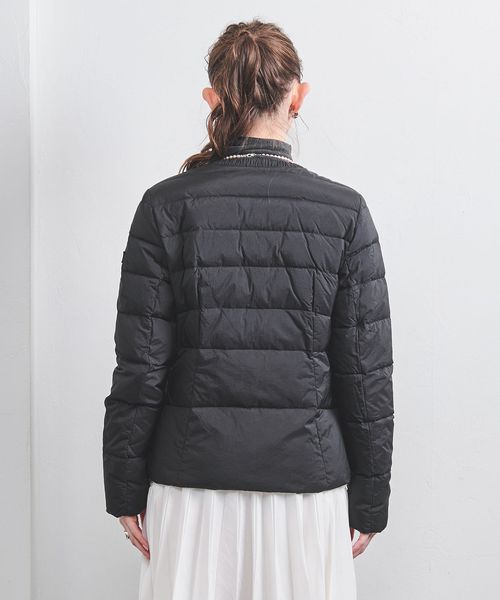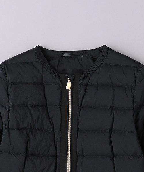 ノーカラーで襟元のギャザーが特徴のショート丈ダウンジャケット。