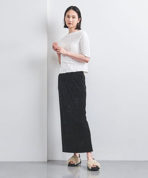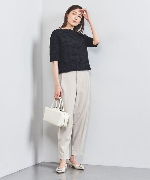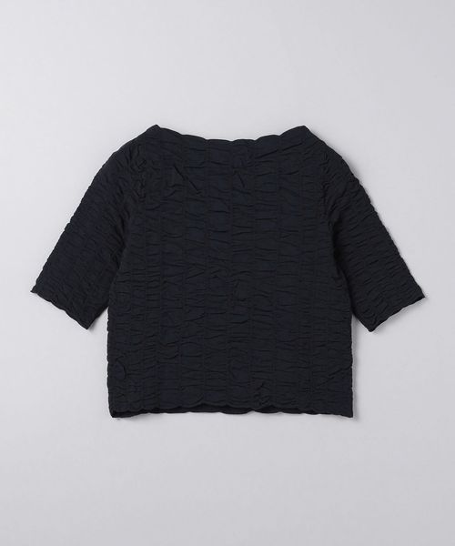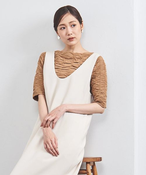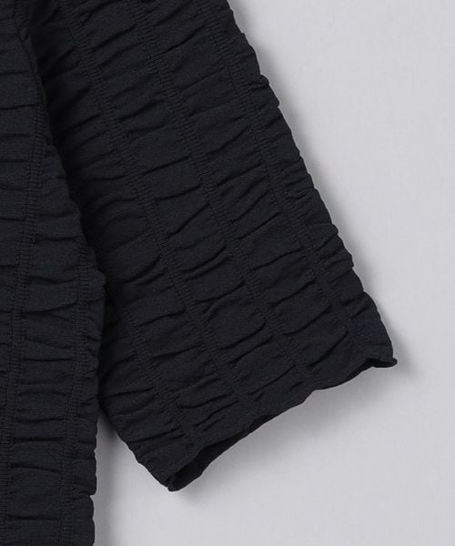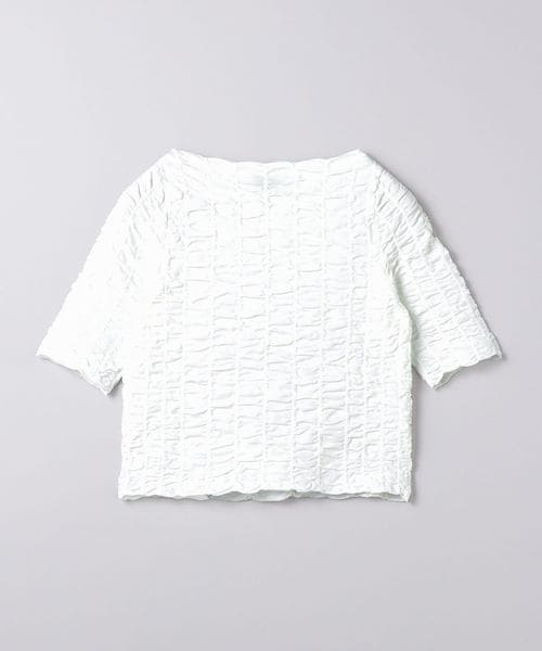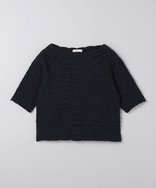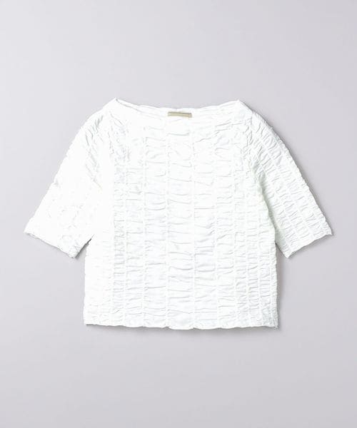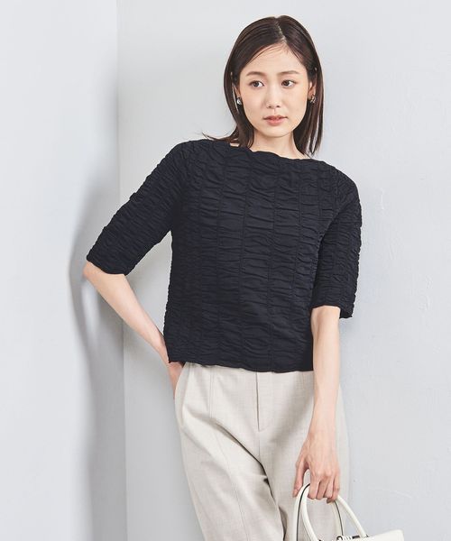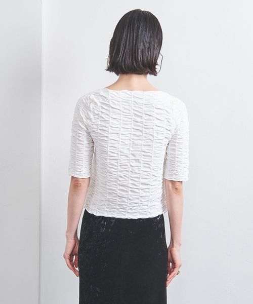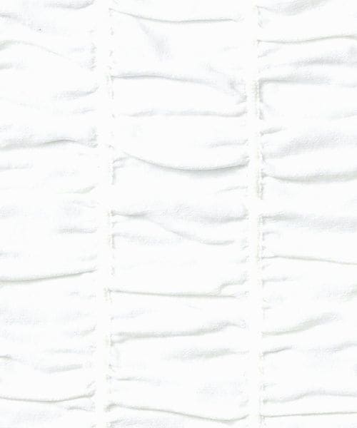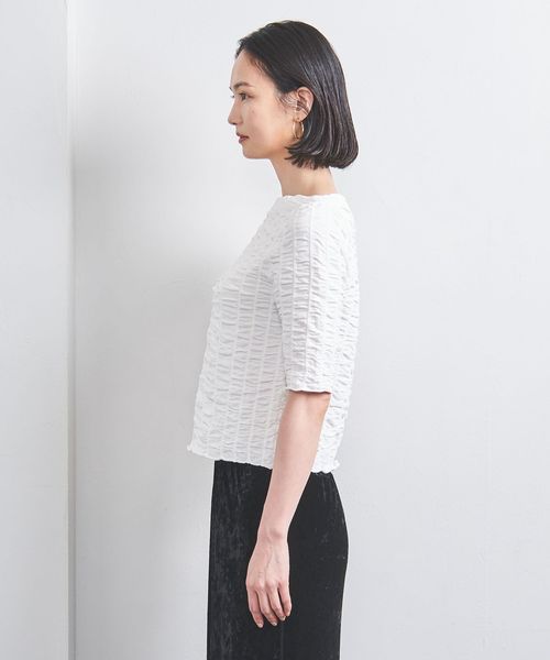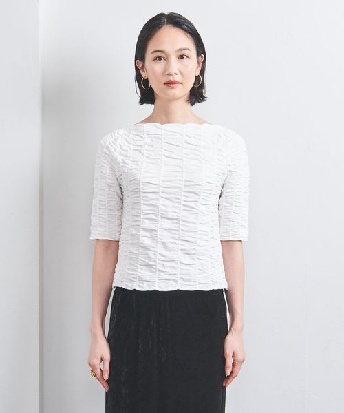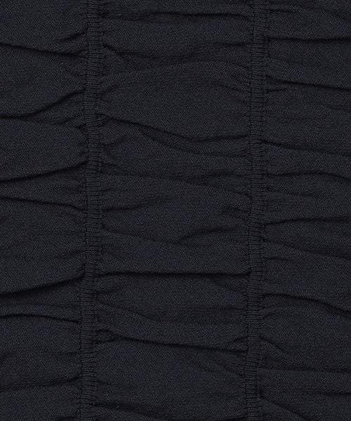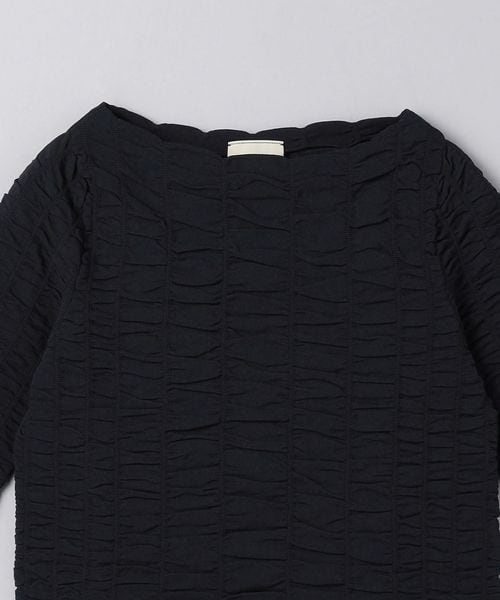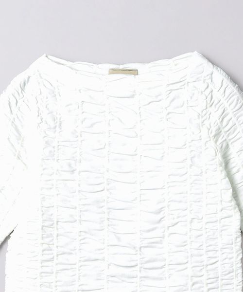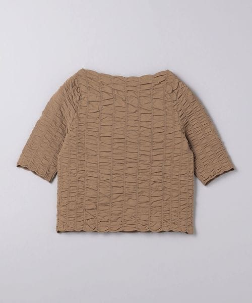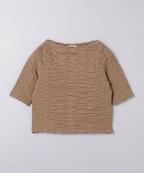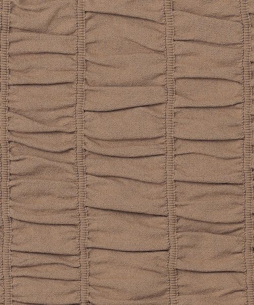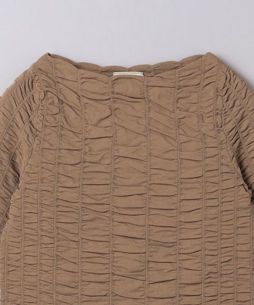 シャーリングの凹凸感がさりげないデザインのニットトップス