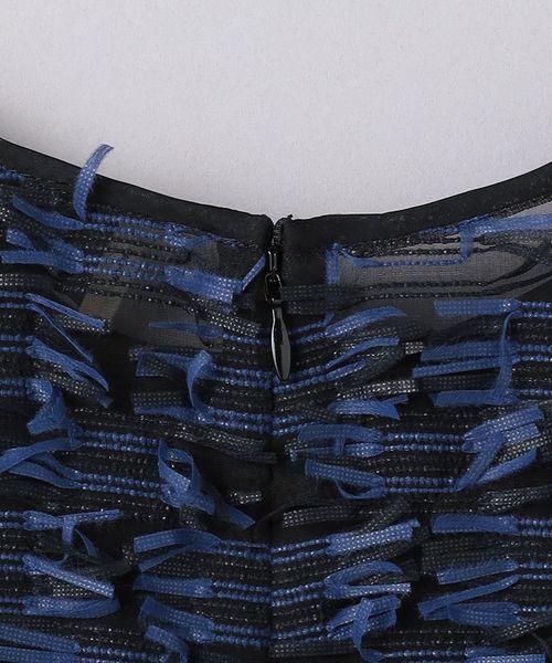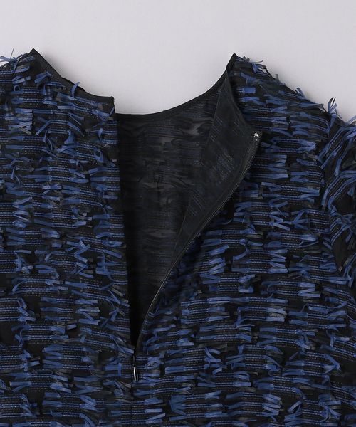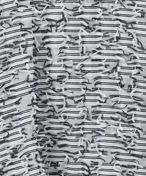 透明感のあるナイロンモノフィラメントとキュプラ強撚糸のシアーベースに、ナイロン不織布をテープ状に打込み、カットしたジャカード生地。