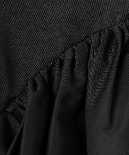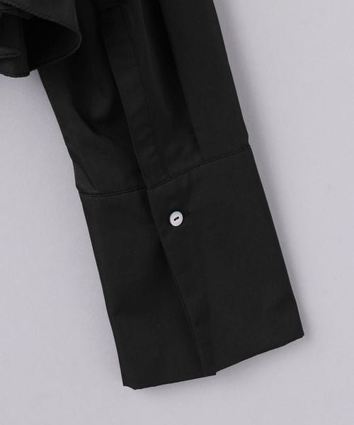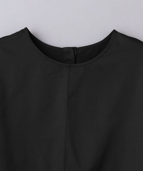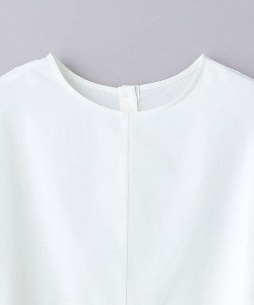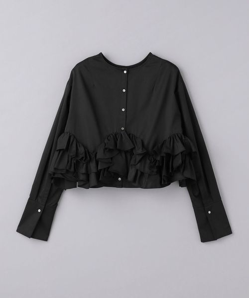 ウエスト部分のラッフル使いと短めの丈、他をシンプルなバランスでまとめた甘すぎない印象のブラウス。