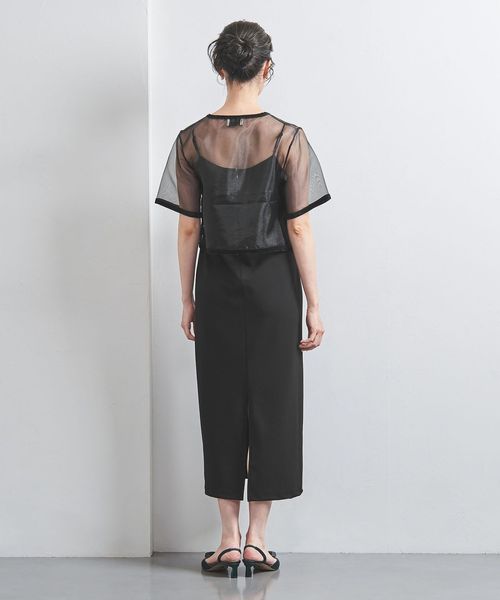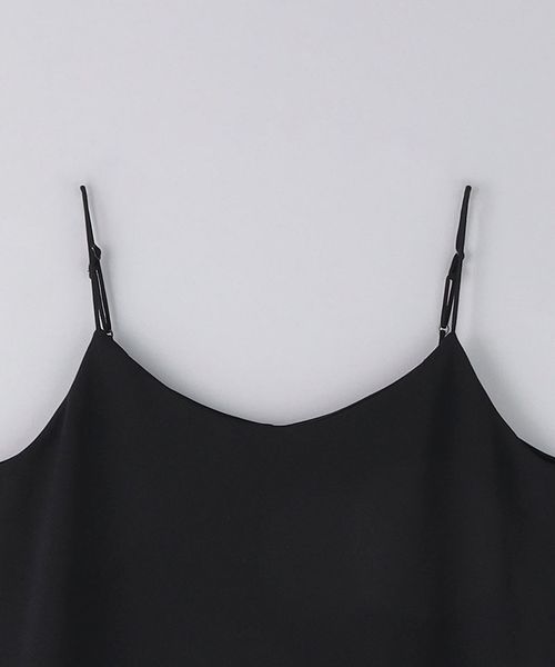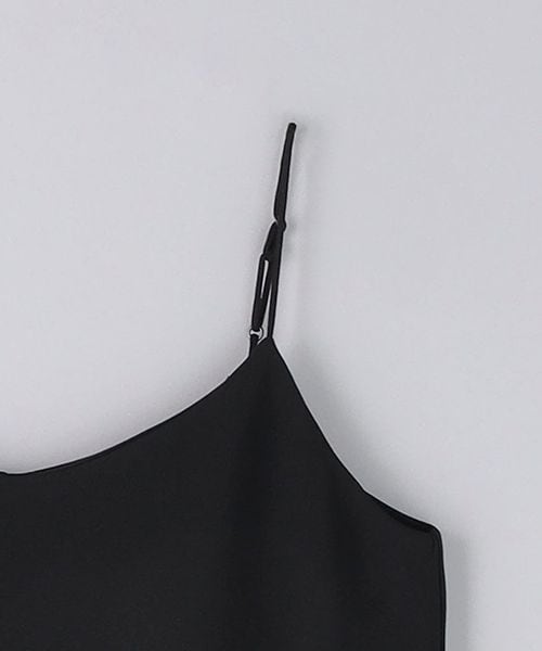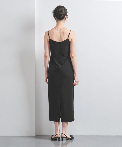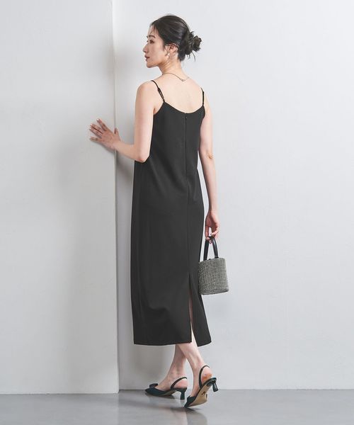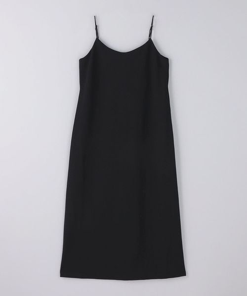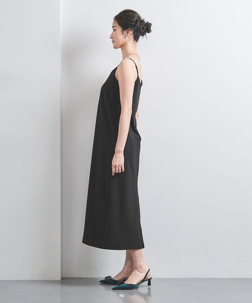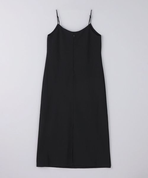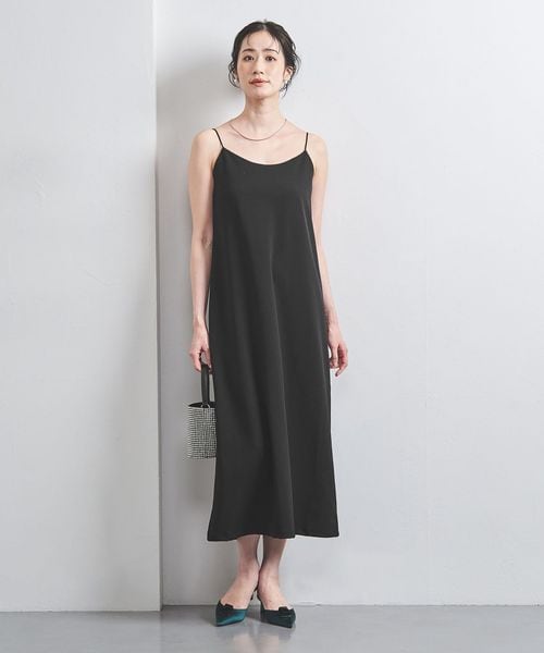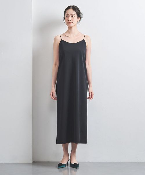 ワンピースは身体のラインを拾いにくい適度な肉感で布帛ライクなきれいめ見えのジャージ素材を使用したキャミソール型。