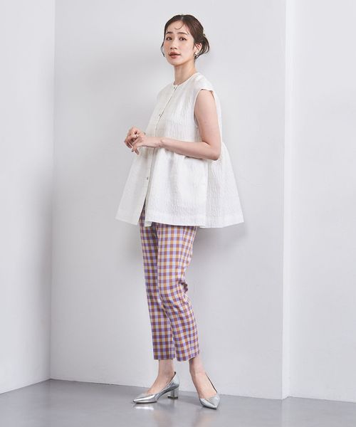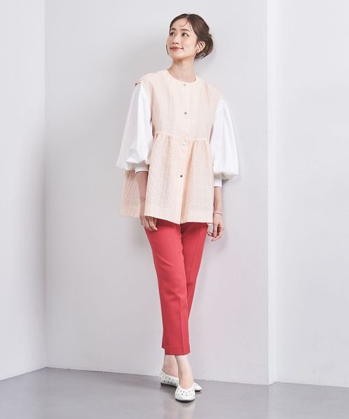 細身のテーパードパンツとボリュームスリーブブラウスやフィットシルエットニットなどとの組み合わせがおすすめです。