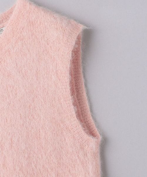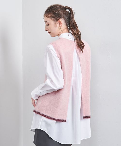 浅めのVネックのベスト型で、一枚着からブラウスとのレイヤードスタイルもおすすめです。