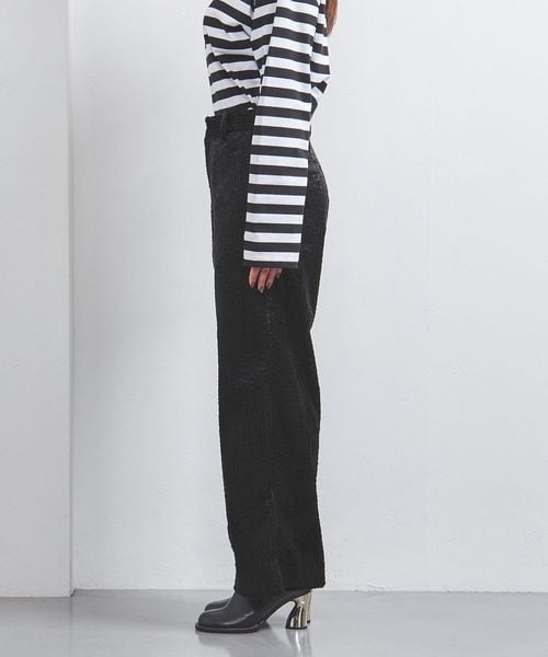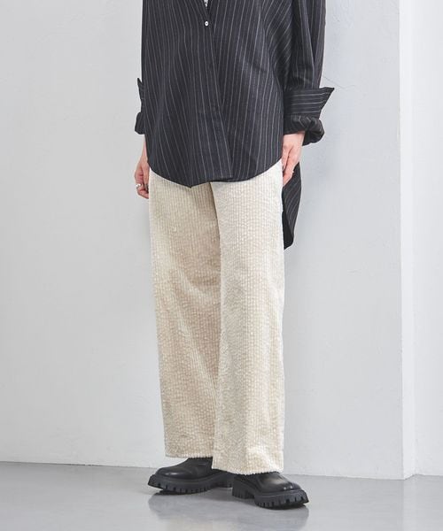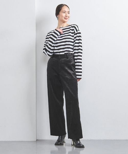カジュアルな素材ながらも光沢がありきれいめな印象で、ポイントになるボトムです。