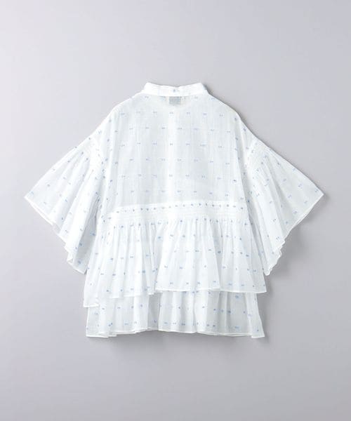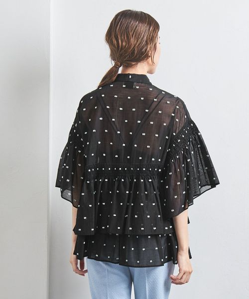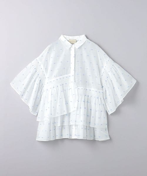 シャーリングディテールとイレギュラーギャザーから広がるボリュームフリルが特徴のデザインブラウス。