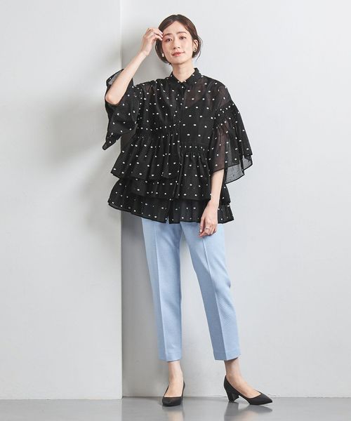 やや丈長めでボリュームシルエットのブラウスなので、細身テーパードパンツとの合わせがおすすめです。