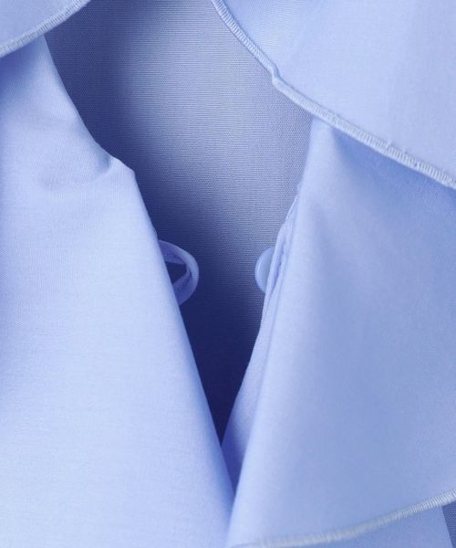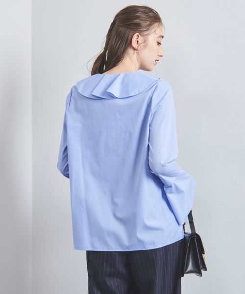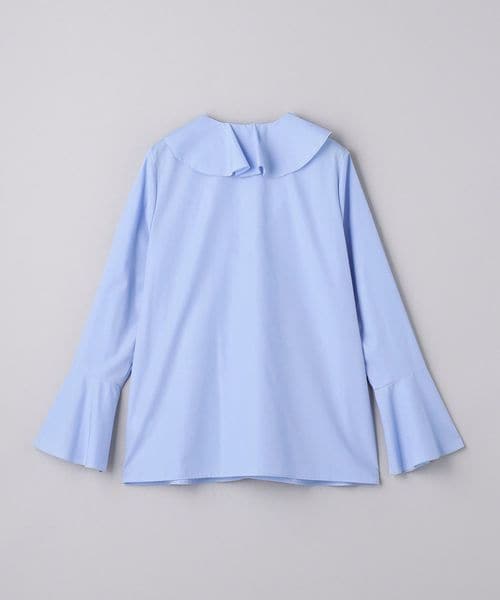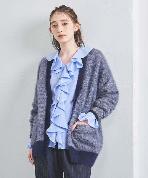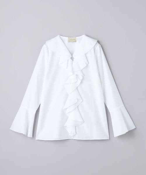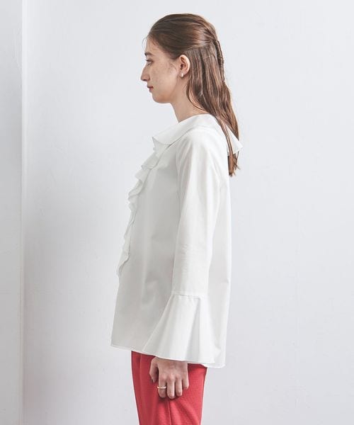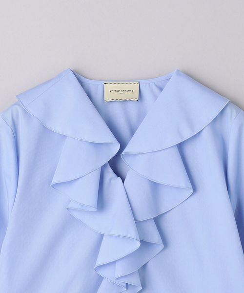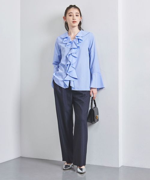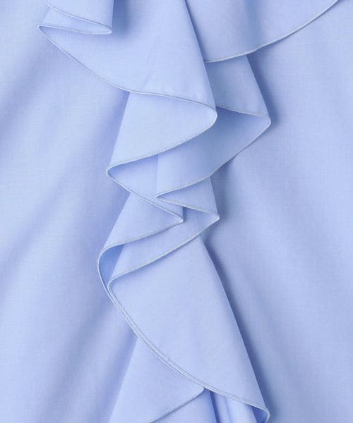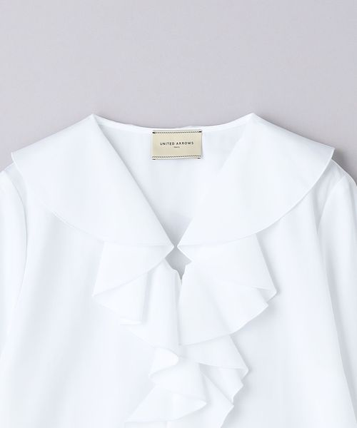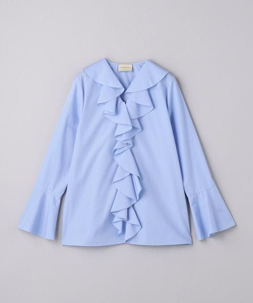 カーディガンのインナーとしても華やかな襟〜前立てに続く立体的なラッフルフリルがポイントのVネックブラウス。