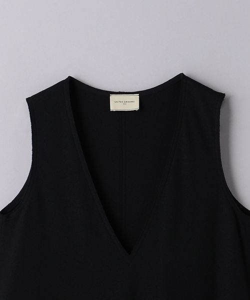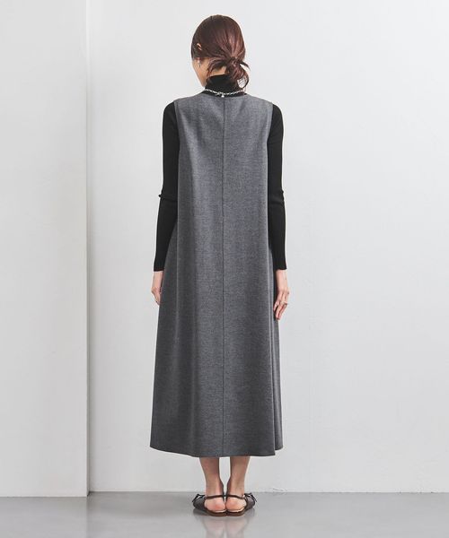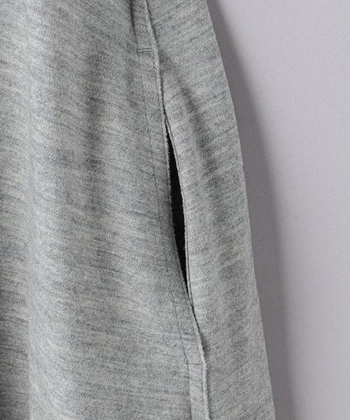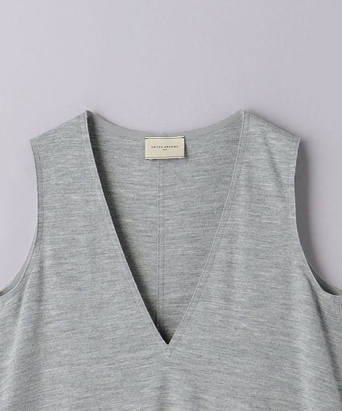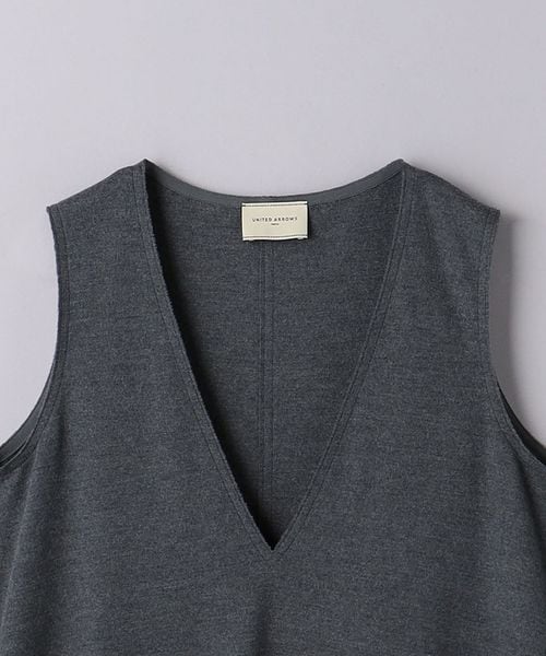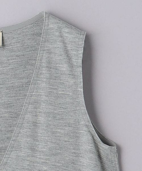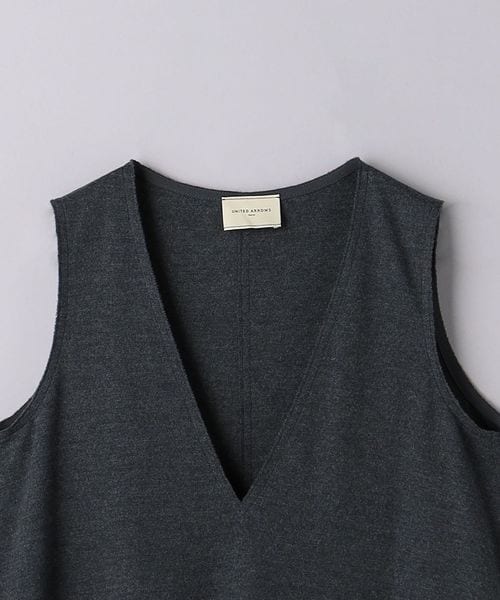 襟ぐり・アームホール・裾は裁ち切り+ステッチ仕上げで、ウール素材でも軽さのある印象に。