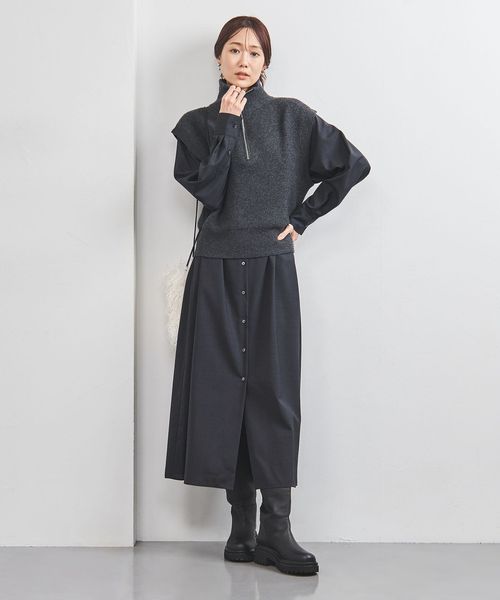 ドロップショルダーぎみの台形シルエットで、スカートにもパンツにも合わせやすい着丈バランスです。