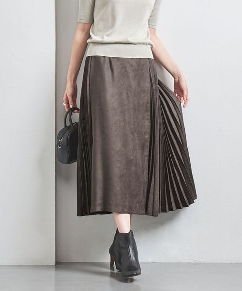 スエード調の素材特性を生かして、サイドからバックにプリーツ加工を施したスカート。