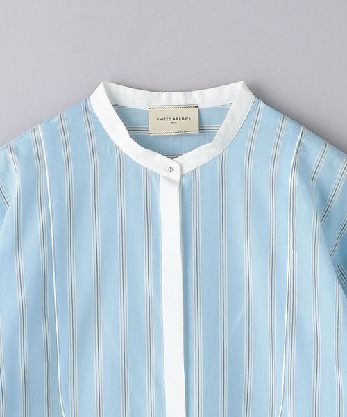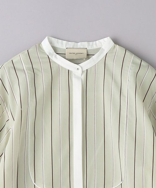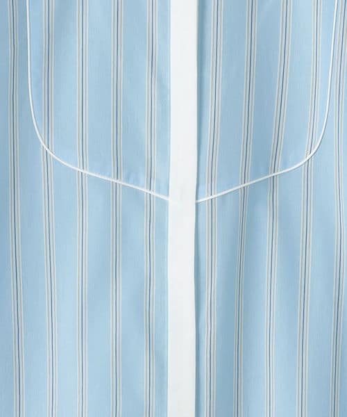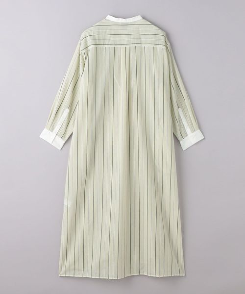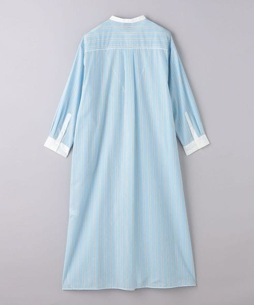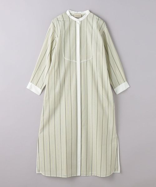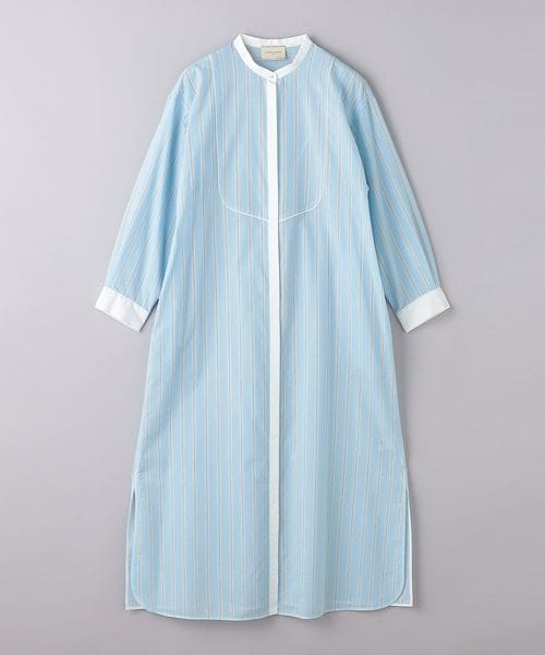 無地配色のバンドカラー・前立て・カフス・パイピングとギボシがポイントのロングシャツワンピース。