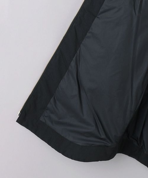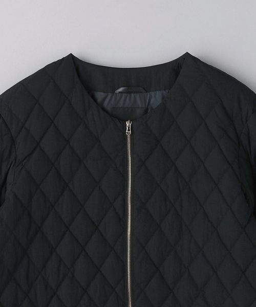 すっきりとしたノーカラーデザインで、ダウンの膨らみを抑えるダウンステッチとウエストのシェイプが美しいシルエットを構築。