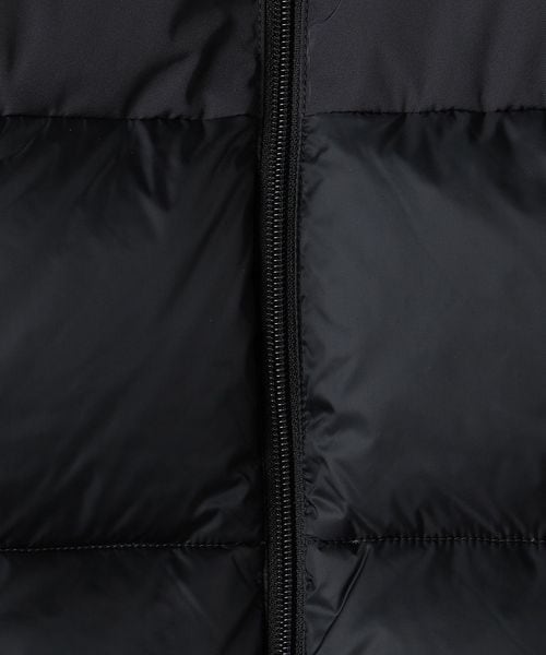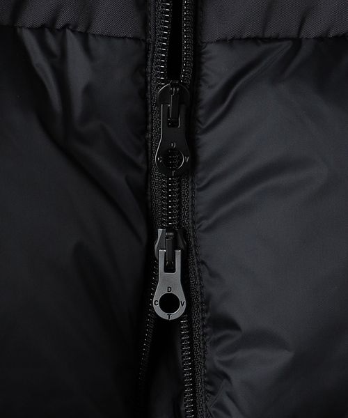 上部はマットな質感のポリエステル、下部はシルキーな光沢感のナイロン素材に切り替えらえれたショートダウン。