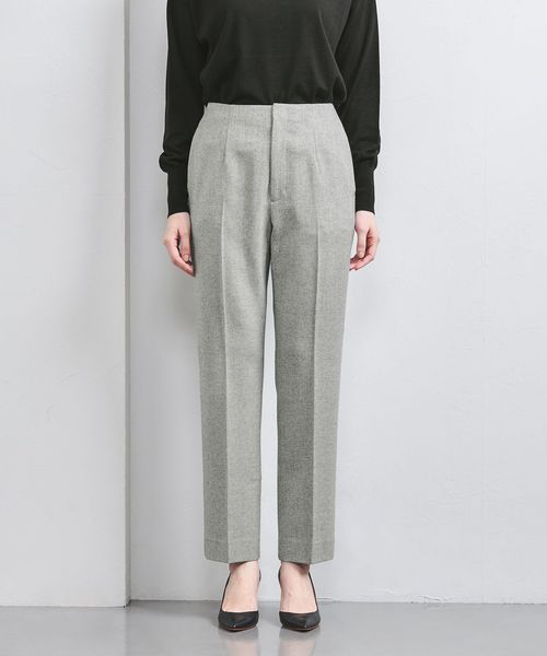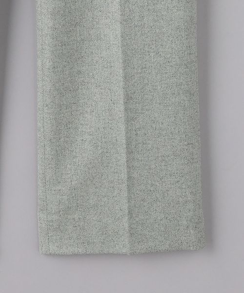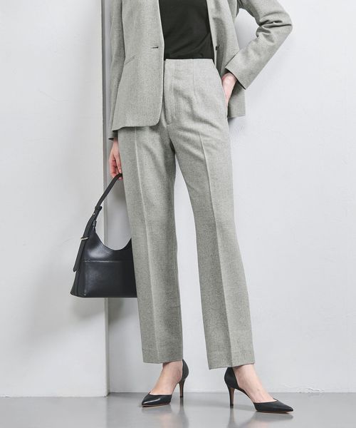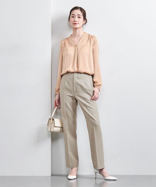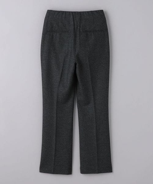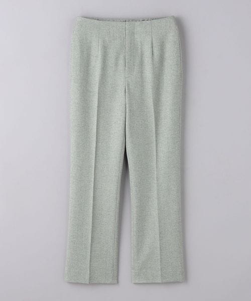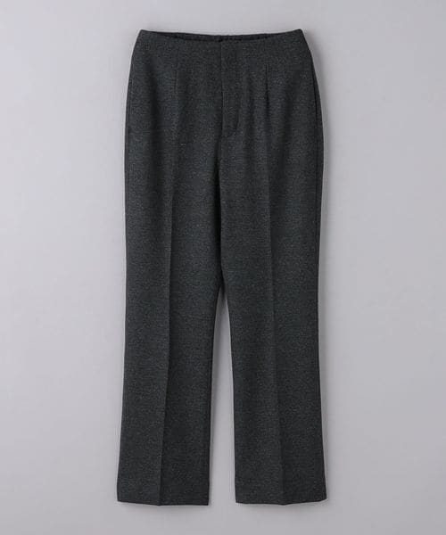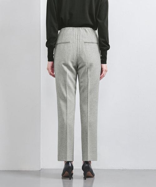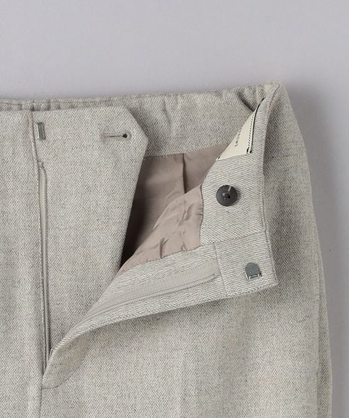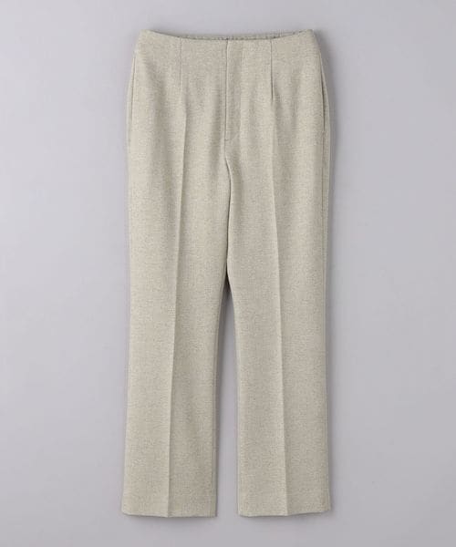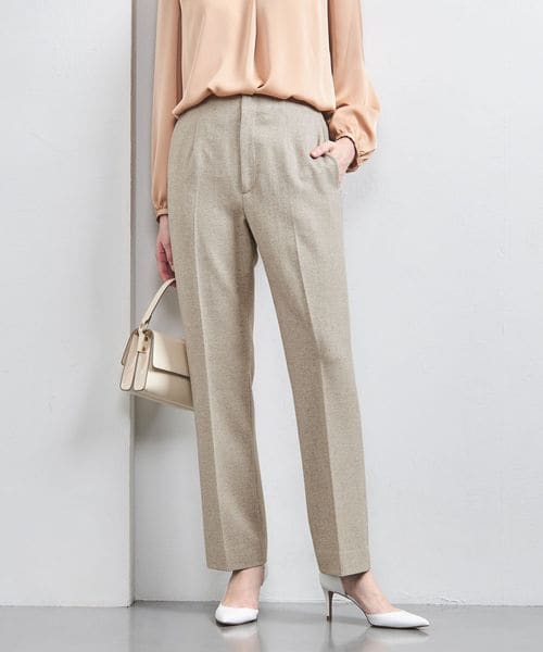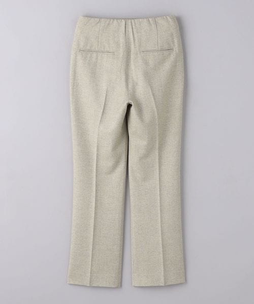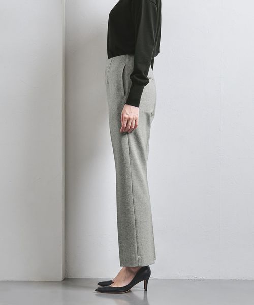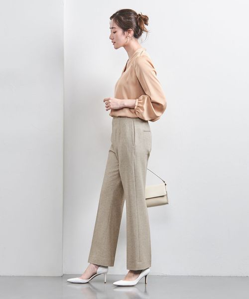 ノータック、ベルトレスでややハイウエストのスタイルアップ見えするデザイン。