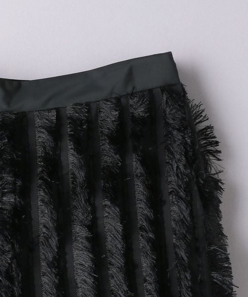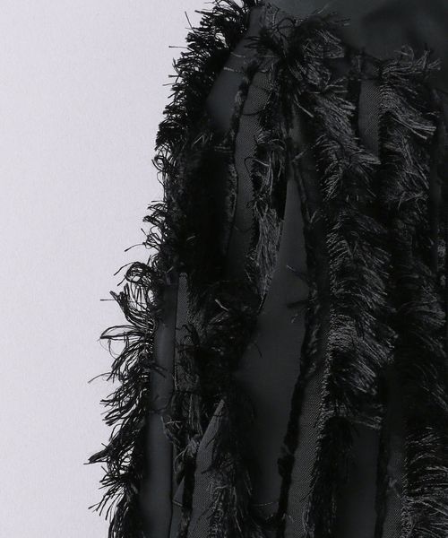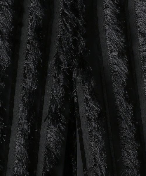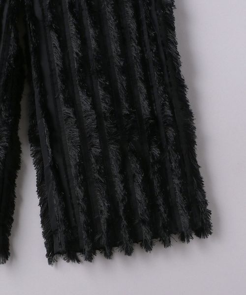 ボーダー状に糸を浮かせ、フリンジ状に片側を長めにカットしたカットジャガードを、ストライプ柄に見えるように使用しています。