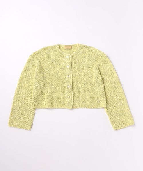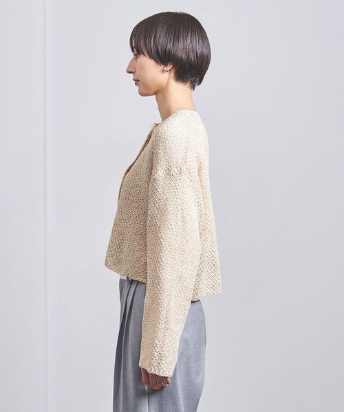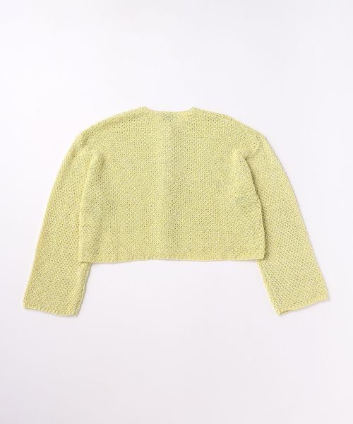 幅広の袖、短めの着丈のシルエットに、襟ぐりから前立てにかけてカギ針編みのトリミング仕上げを施しています。