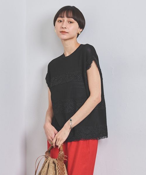 オリジナルで作成したレーステープを袖口、身頃にほどこした華やかな印象のレースコンビトップス。