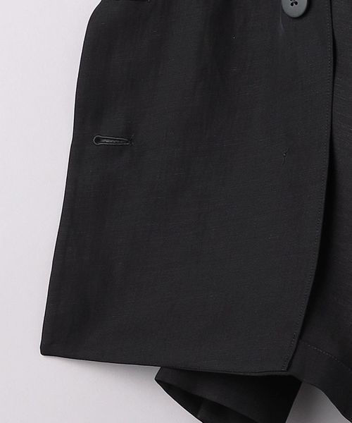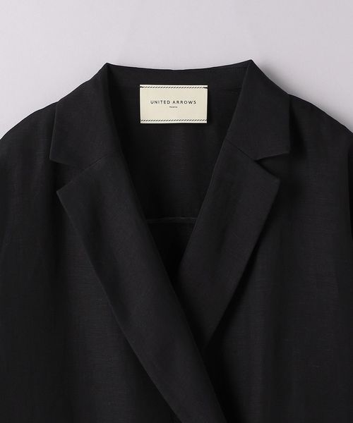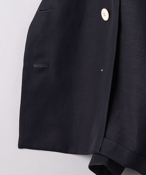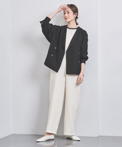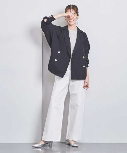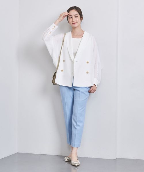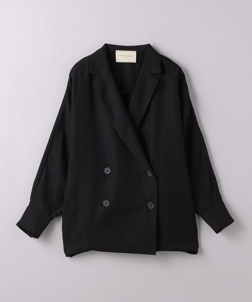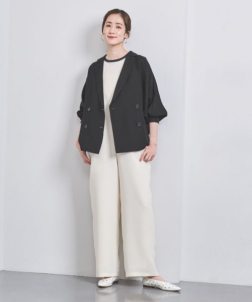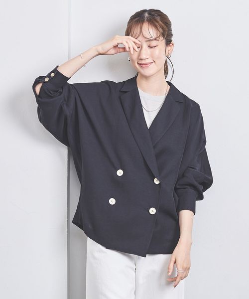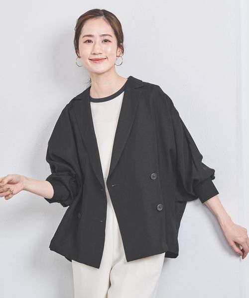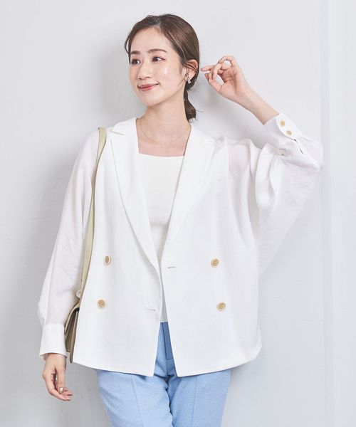身頃続きのドルマンスリーブで抜け感と女性らしさを感じ、ダブルブレストデザインできちんと見えもする一着。