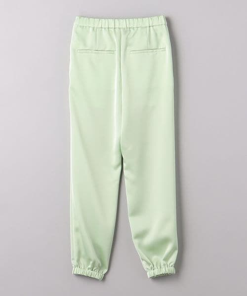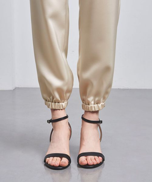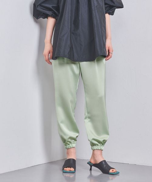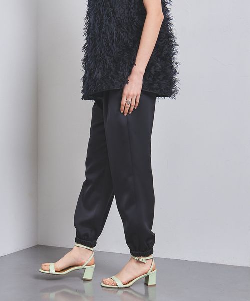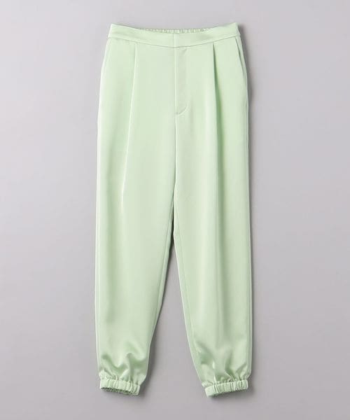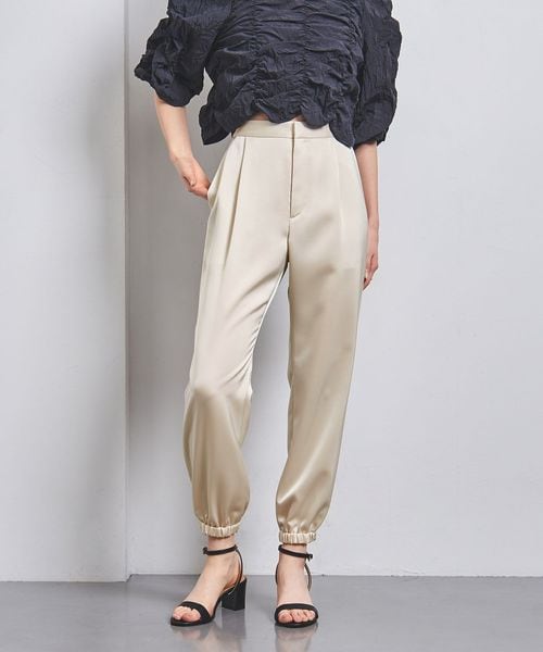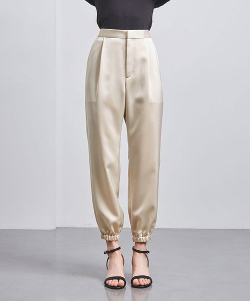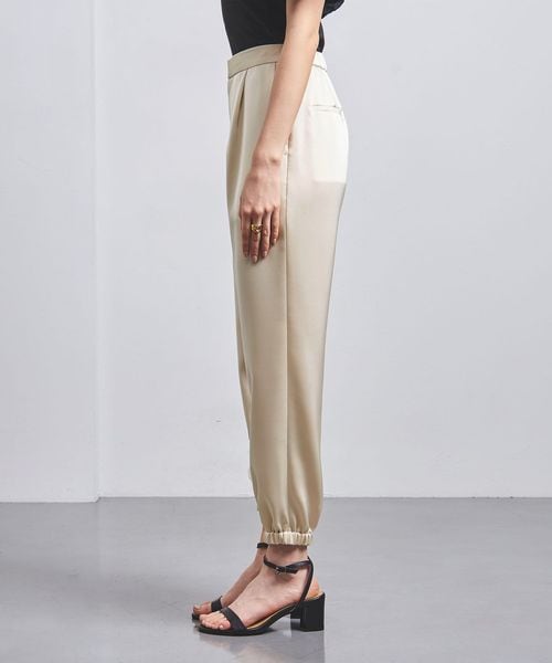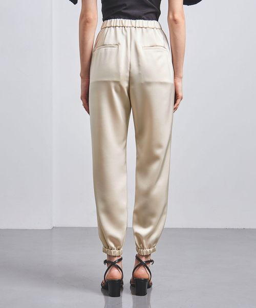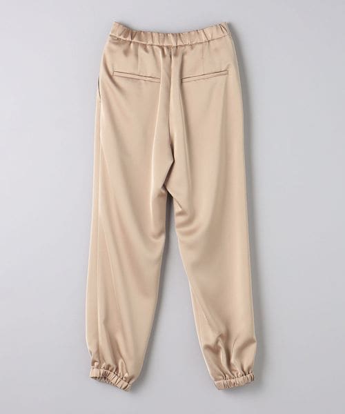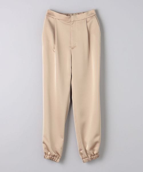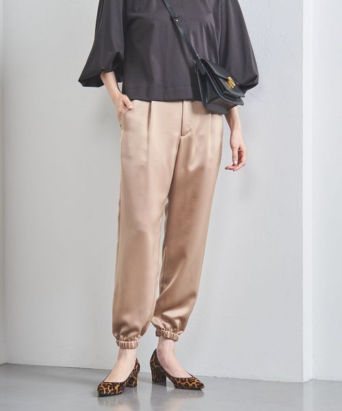 裾に平ゴムを入れた裾絞りのシルエットがややカジュアルな印象ながら、きれいめな素材を使用することで大人な印象に仕上たジョガーパンツ。